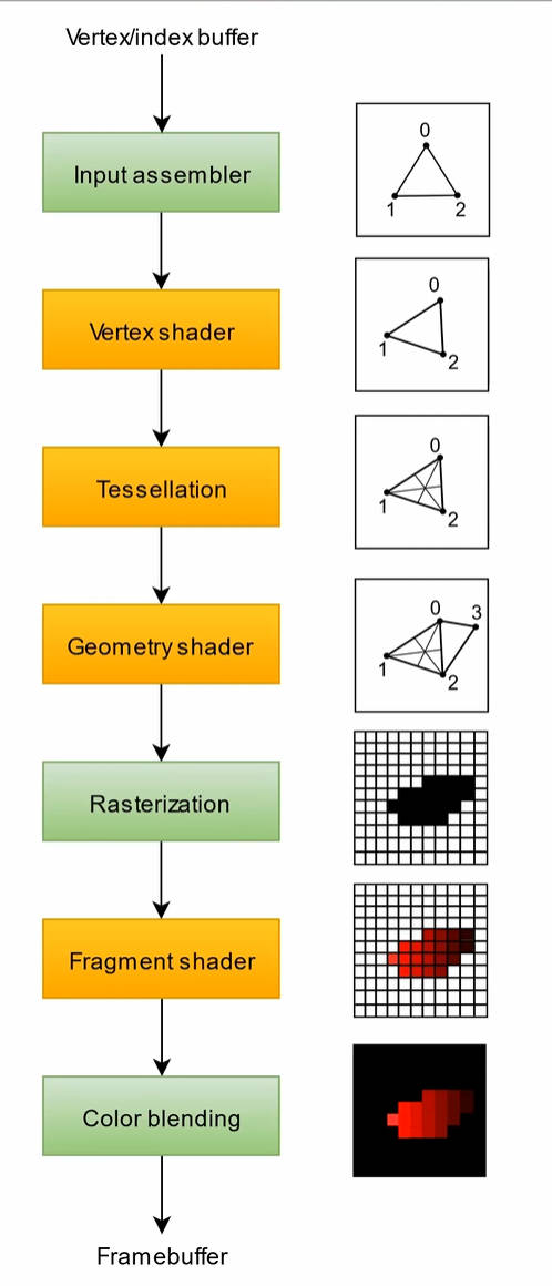 下图是一个标准的渲染管线(橙色的方块是可以编程的部分)。
